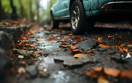 Close-up of muddy car tire on cracked wet road with blurred background