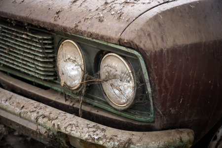 Dirty Headlights car covered in mud.