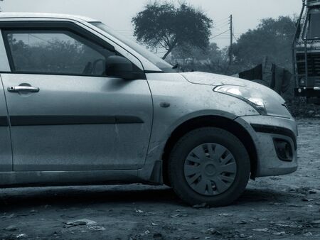 Detail of white cars very dirty from rains of mud, unwashed and neglected, covered in dust.