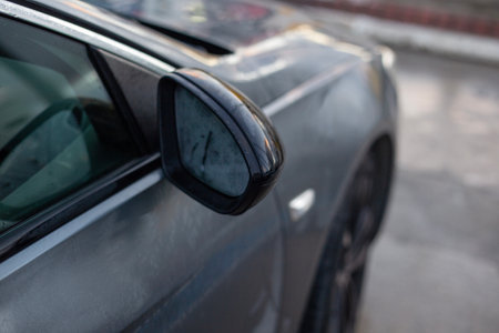 Close-up of a wet side mirror on a gray car, rearview mirror covered in morning dew
