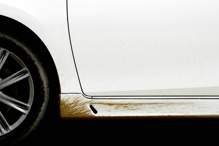 splashes of mud from wheel on a white car