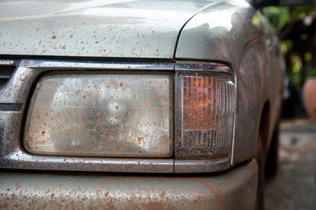Headlight of an old car with dust and dirt on it. vintage car