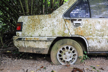 Chiang Mai, Thailand - September 5, 2020. Dirty and wreck cars at the car cemetery.