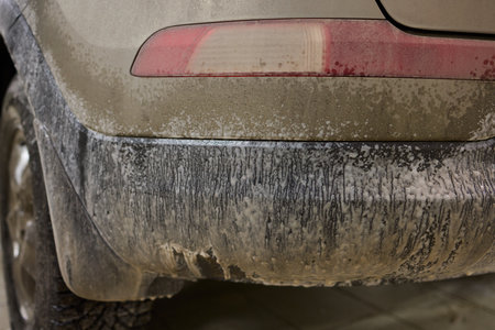 part of the car covered with mud. The bottom of the car is covered with clay.