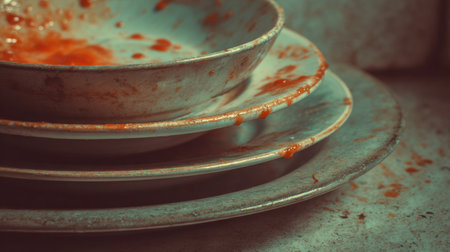 Several dirty plates are stacked in a sink, covered in sauce stains, surrounded by a disordered kitchen setting reflecting recent cooking activities.