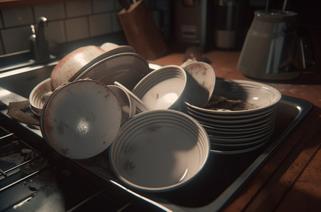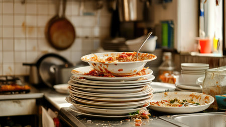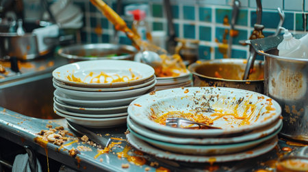 This image of a messy kitchen showcases numerous dirty dishes piled high, creating a chaotic scene marked by food remnants and clutter. The unwashed plates and cookware emphasize the need for a thorough cleaning and highlight everyday life struggles.