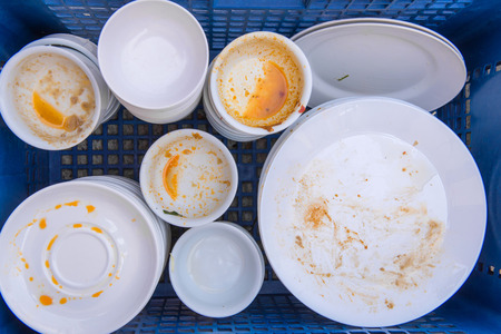 many pile dish dirty, pile plate of food is waste trash in basket plastic dirty, pile empty and dirty dish after eating food, plate dirt