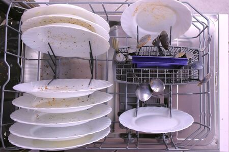 Loading the dishwasher with dirty dishes. Dirty white saucers. Preparing the dishwasher for the cycle of washing dirty dishes. Housework. Grey dishwasher.