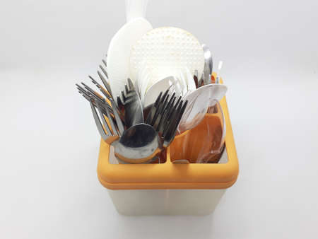 Various Colorful Metallic Stainless Spoons Forks Packaging Container for Kitchen Utensils in White isolated Background
