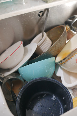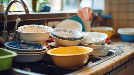 A cluttered kitchen sink filled with a variety of dirty bowls and plates showcases the everyday life of home cooking and family meals, capturing moments of domesticity.