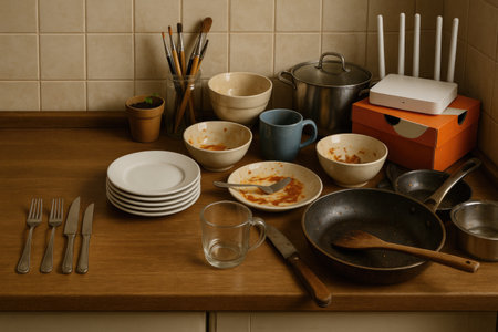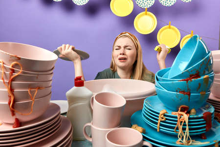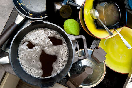 Dirty dishes in the kitchen as a symbol of household fatigue