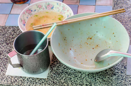Empty plates and chopsticks on a wooden table in a restaurant.