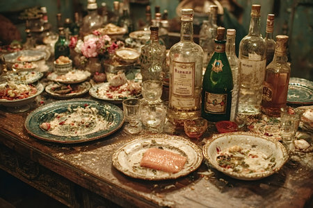 Remains of luxurious banquet showing dirty plates, glasses, empty bottles and leftover food scattered on messy wooden table, depicting aftermath of extravagant celebration