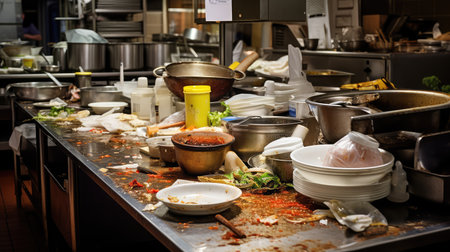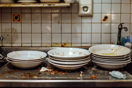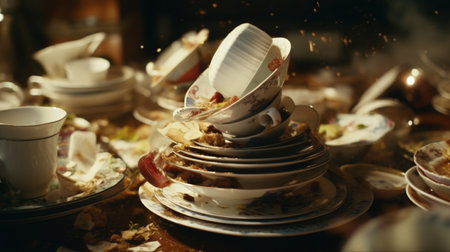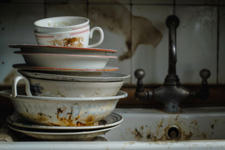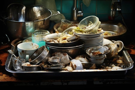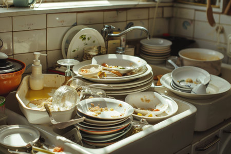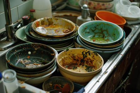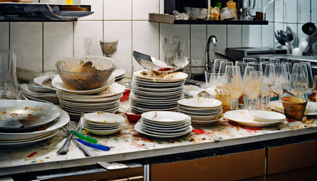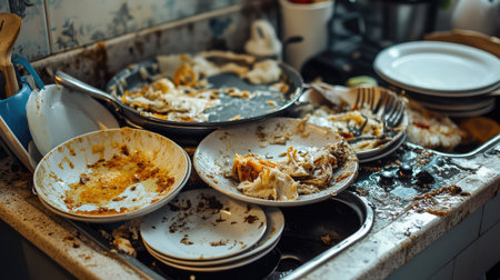 This image of a messy kitchen showcases numerous dirty dishes piled high, creating a chaotic scene marked by food remnants and clutter. The unwashed plates and cookware emphasize the need for a thorough cleaning and highlight everyday life struggles.