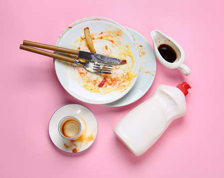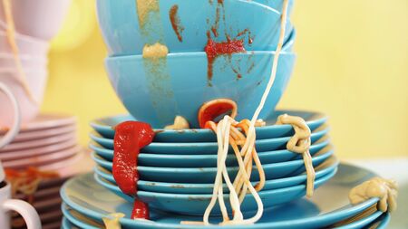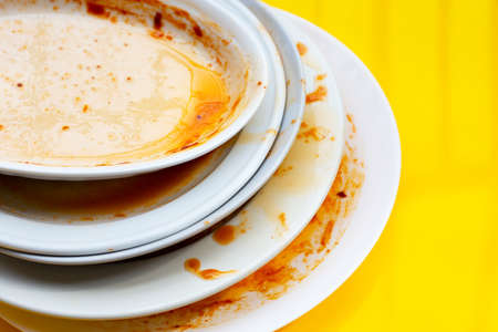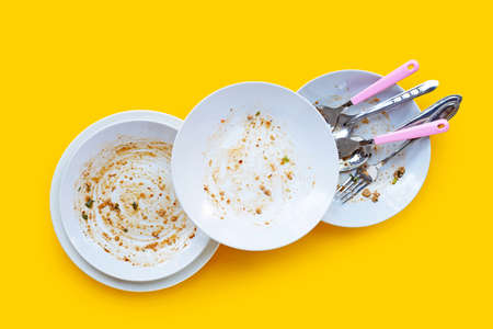 Kitchen table full of dirty dishes, isolated yellow background. close up. Studio shot.
