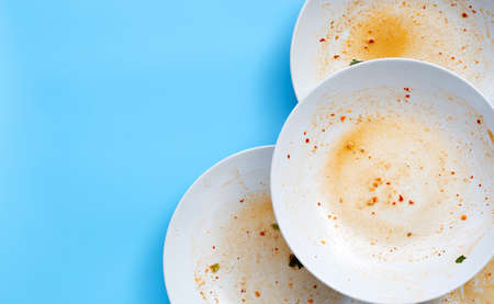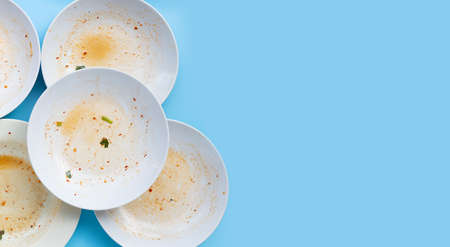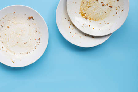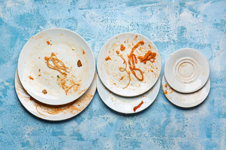 overhead shot of a table with untidy dishes and leftovers, on blue