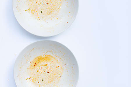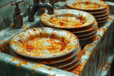 Close-up view of a sink filled with dirty plates stained with tomato sauce and water marks, showing the need for cleaning.
