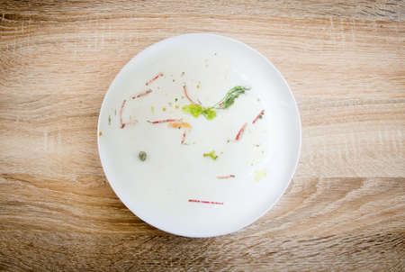 Plate of pasta with sauce finished and dirty on a wooden table. top view