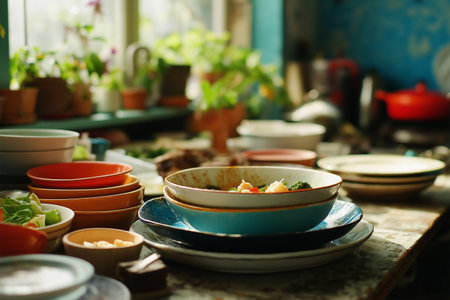 Colorful bowls and plates displayed on a rustic kitchen table filled with fresh ingredients and greenery