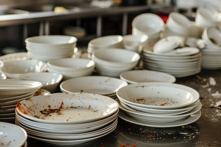 Dirty plates and glasses after a meal in the kitchen in the restaurant. Heap or pile of unclean glass and plates of breakfast or lunch table
