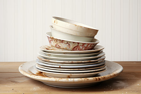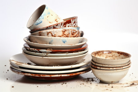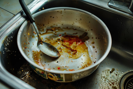 Pile of dishes greasy dirty with some ketchup and mayonnaise mixed. Generative AI