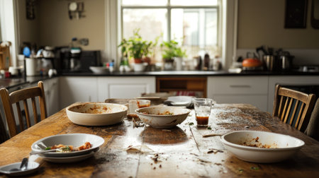 A close-up view of a messy dining table with leftover food, dirty dishes, and a glass, capturing the essence of home life and meal preparation in a kitchen setting.