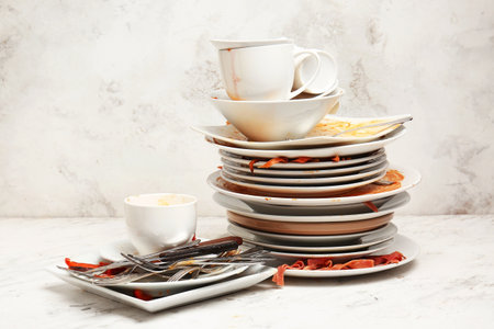 Pile of dirty oily messy plates, glass, cups, fork spoons after meal
