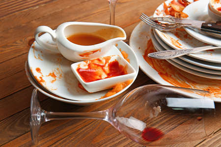 Empty dirty plates with spoons and forks on the table after meal. Banquet ending concept. Unwashed dishes ready to cleaning