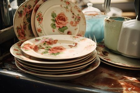 A rustic table captures the essence of a cozy meal with scattered vintage dishes and remnants, evoking warmth, comfort, and a sense of togetherness in dining.