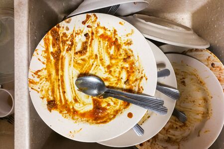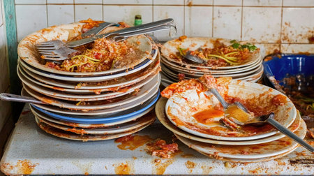 A pile of dirty dishes with food scraps and leftover sauces, ready to be cleaned, emphasizing the mess of post-dinner cleanup.