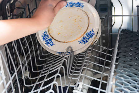 Loading the dishwasher with dirty dishes. Dirty white saucers. Preparing the dishwasher for the cycle of washing dirty dishes. Housework. Grey dishwasher.