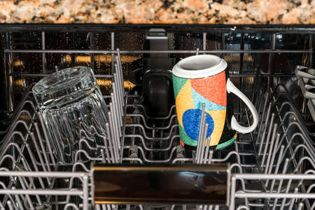 Open dishwasher with clean glass and dishes selective focus Clean glasses after washing in the dishwasher.