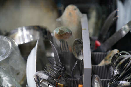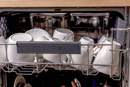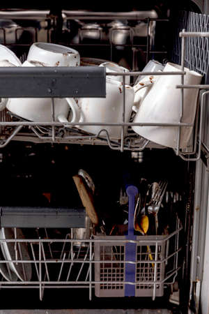 Unwashed, dirty dishes in dishwasher. Mess in the kitchen. Dirty kitchenware, plates and mugs. Messy dishware. Close up view.