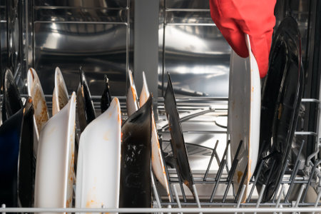 hand in a rubber glove puts dirty dishes in the dishwasher