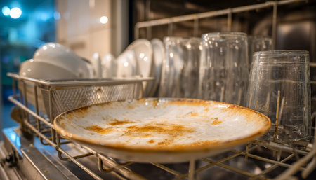 Close-up of plates in the dishwasher. Household chores and washing dishes.
