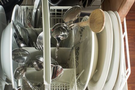 dishwasher with clean dishes at home in the kitchen, washing dishes, clean plates from the dishwasher