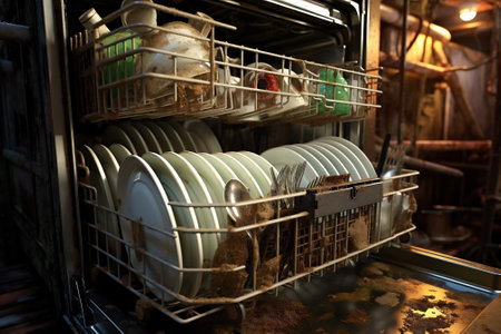 A dishwasher full of dishes with water spraying out from the bottom, AI