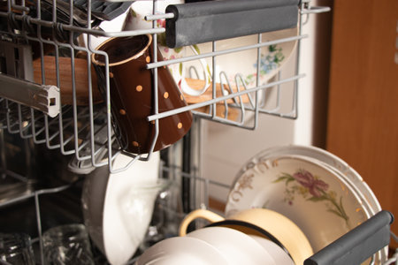 Open door of built-in dishwasher with clean plates and dishes at kitchen. Housework
