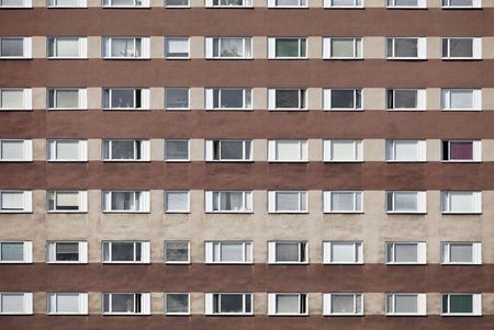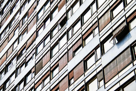 close up to a building, pattern of windows of a gray building, close up to a large building,