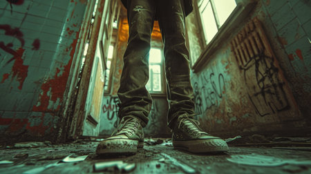 Close up of a man standing in an abandoned building, wearing jeans and sneakers