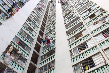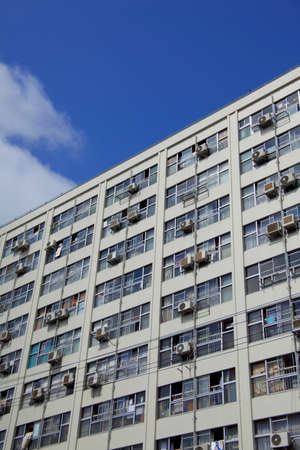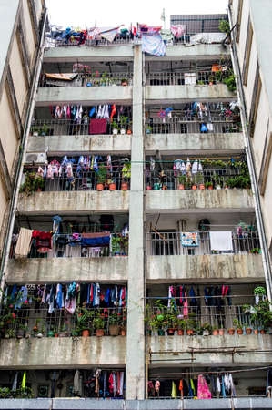 Lookup typical condos with hanging clothes over blue sky in Hanoi, Vietnam