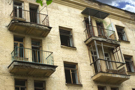 Abandoned uninhabited house with broken windows before renovation side view closeup