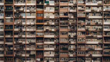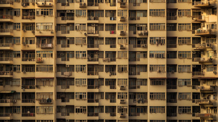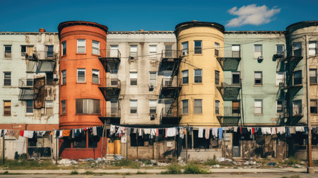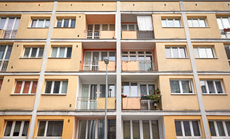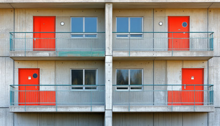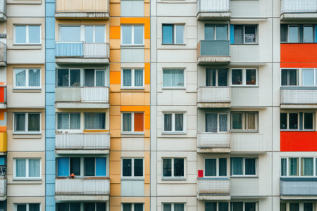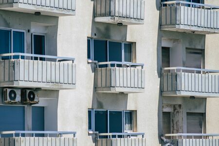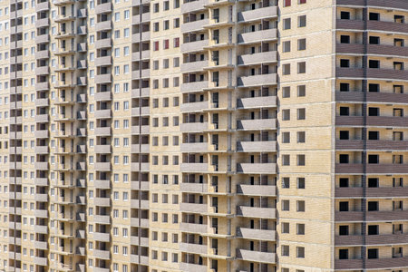 Several buildings with multiple balconies are featured in a daylight scene. The architectural style showcases symmetrical lines and repetitive patterns, with a clear blue sky overhead. This composition lends itself to visual storytelling about urban living, construction, and housing, suitable for editorial or commercial applications.