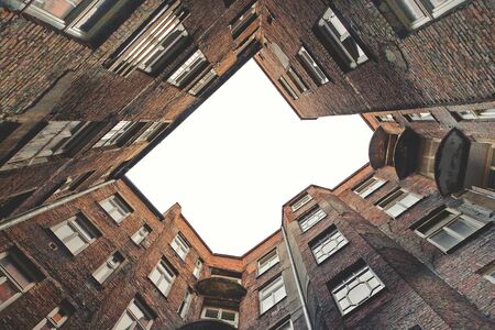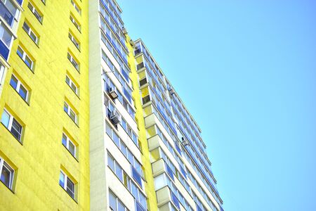 Exterior of new apartment buildings on a blue cloudy sky background. No people. Real estate business concept.