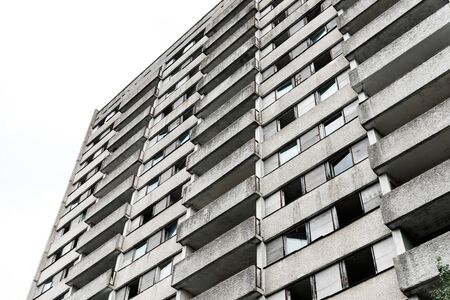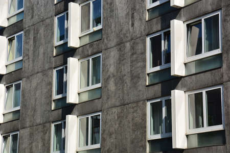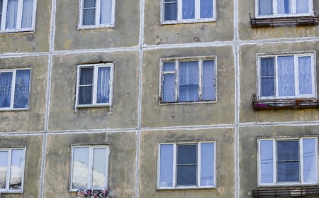 Facade of a grey multi-storey soviet panel building. Russian old urban residential houses with windows. Typical russian neighborhood.