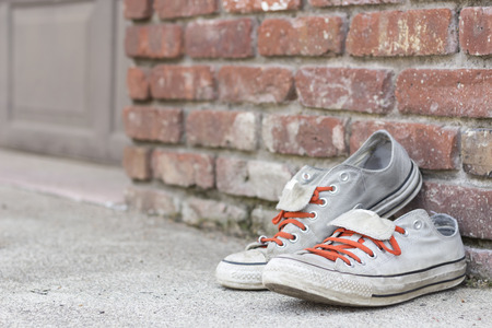 Old worn canvas shoes on a wooden floor Vintage Retro Filter.