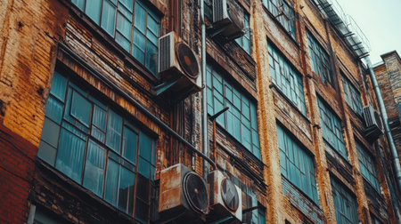 A detailed view of an urban building showcasing several air conditioning units mounted on a weathered brick facade. The blue windows contrast against the textured exterior, highlighting the industrial charm of city architecture.