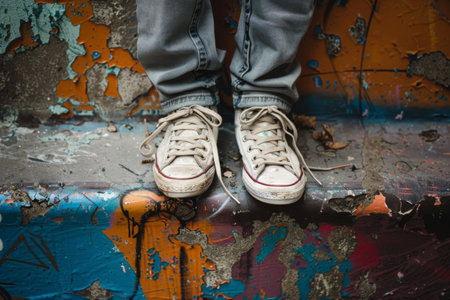 A pair of worn sneakers rests on a graffiti-laden step, showing vibrant colors and faded textures, symbolizing youth and urban culture. The atmosphere feels lively and expressive.