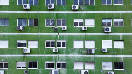 Overwhelmed air conditioning units in apartment buildings, trying to combat heatwaves.
