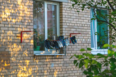 Many different shoes are dried on a rope outside the window. On the ropes. Brick wall. House.